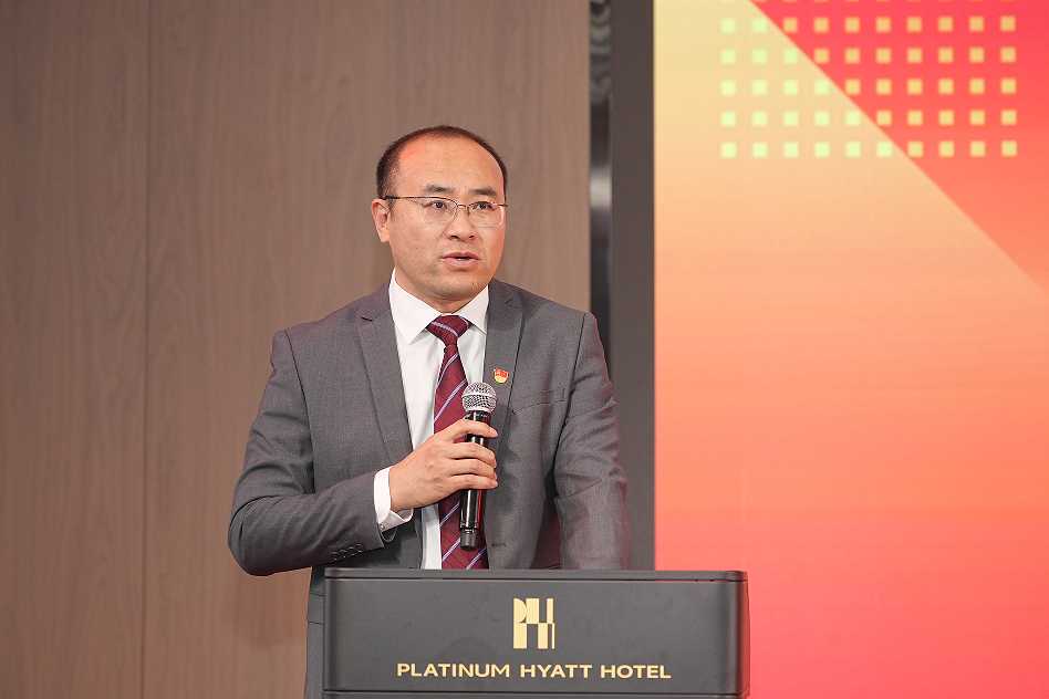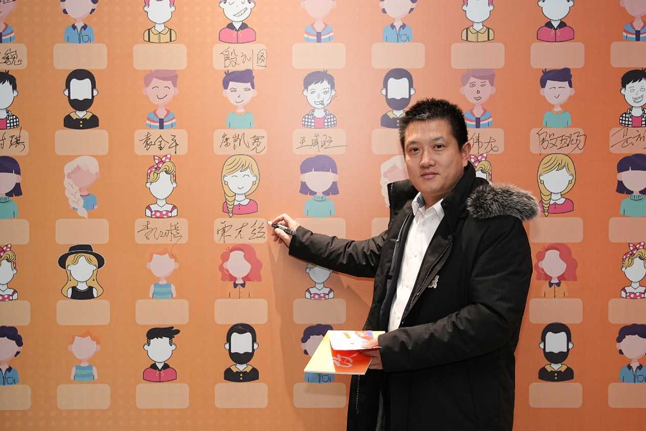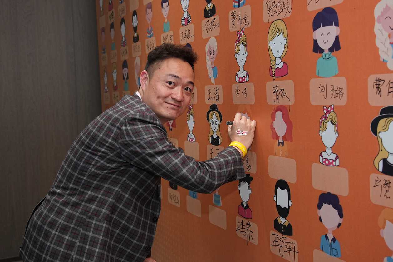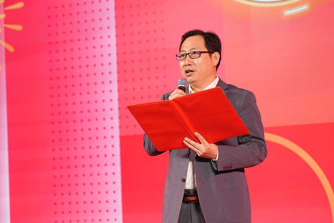 沙龙国际s36科技总裁王功学揭幕2024十九周年视觉宣传标识。